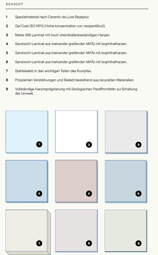 Wir sparen nicht an den Materialien. Wir verwenden die besten Polyesterharze (die auch in der Luft-, Raum- und Schifffahrt und der Windkraftindustrie verwendet werden), die mit Glasfasern verstärkt sind.