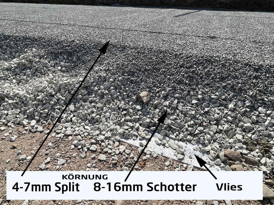 - Feiner Schotter in der Körnung ca. 4-7mm (auch Split genannt) als letzte Schicht